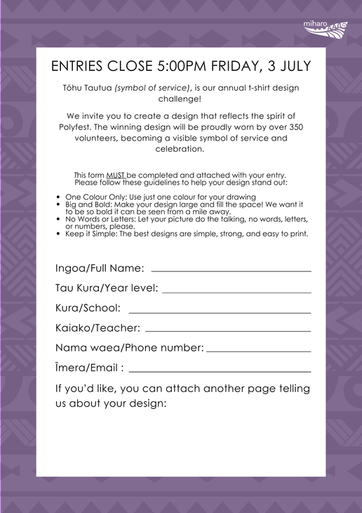 Download a template for Murihiku, or Central Lakes, and take the chance to have your design printed onto our 2026 Polyfest t-shirts, worn by hundreds of volunteers!