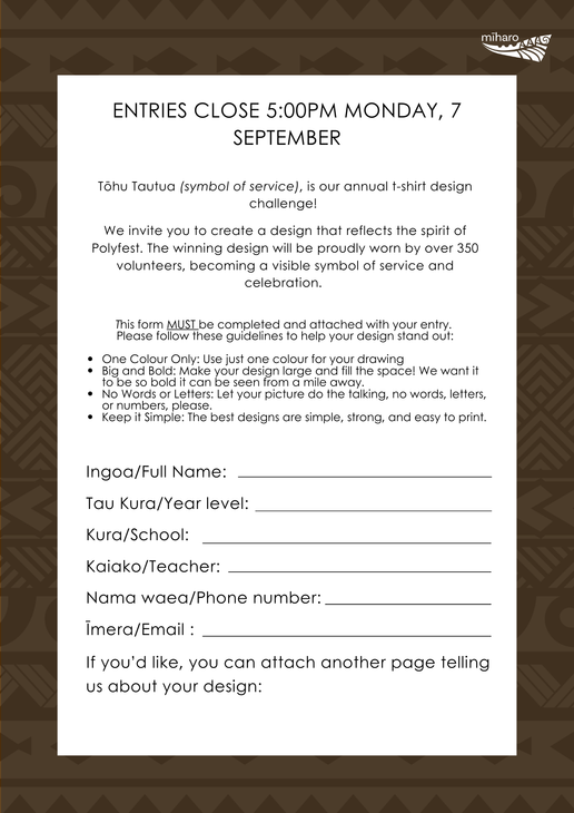 Our annual t-shirt design competition, Tōhu Tautua (symbol of service) is open now!